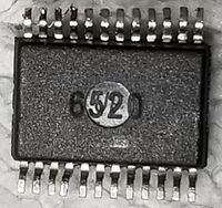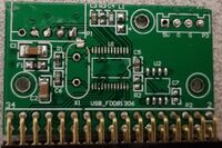This is an adapter for using full-size 3.5" floppy drives as USB floppy drives. It uses an unknown 24-pin TSOP/TSSOP? microcontroller. The chip has "6520" on the underside. The oscillator on the board is 12 mhz.
